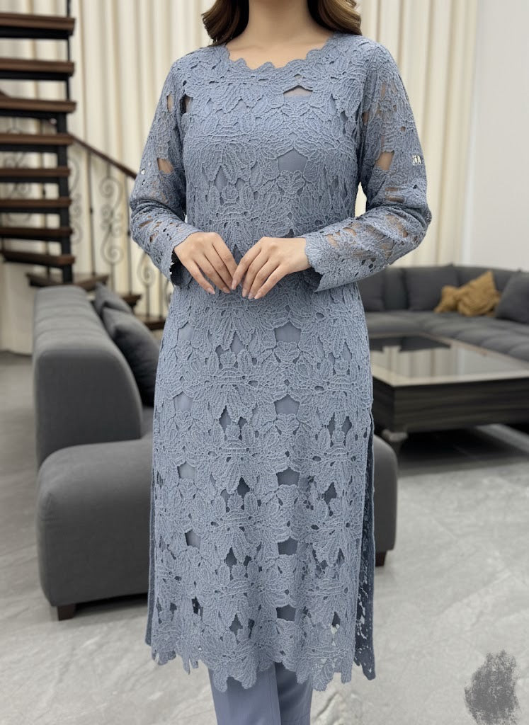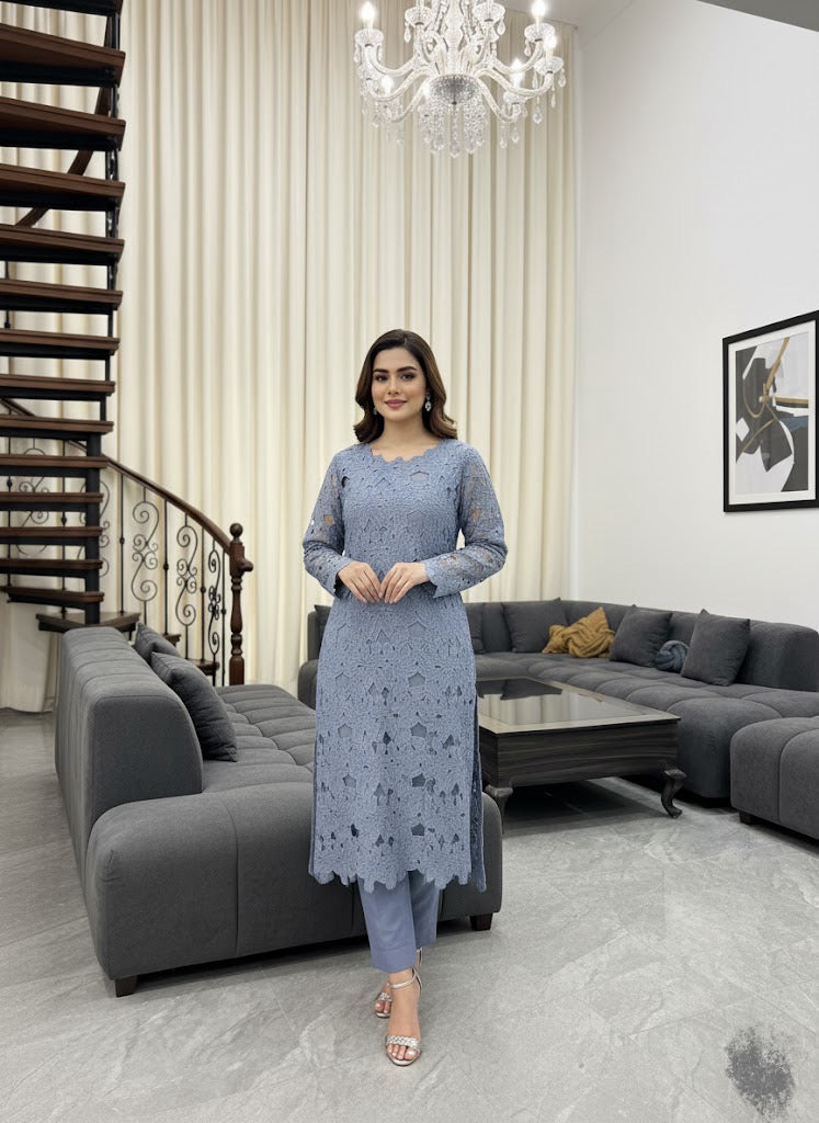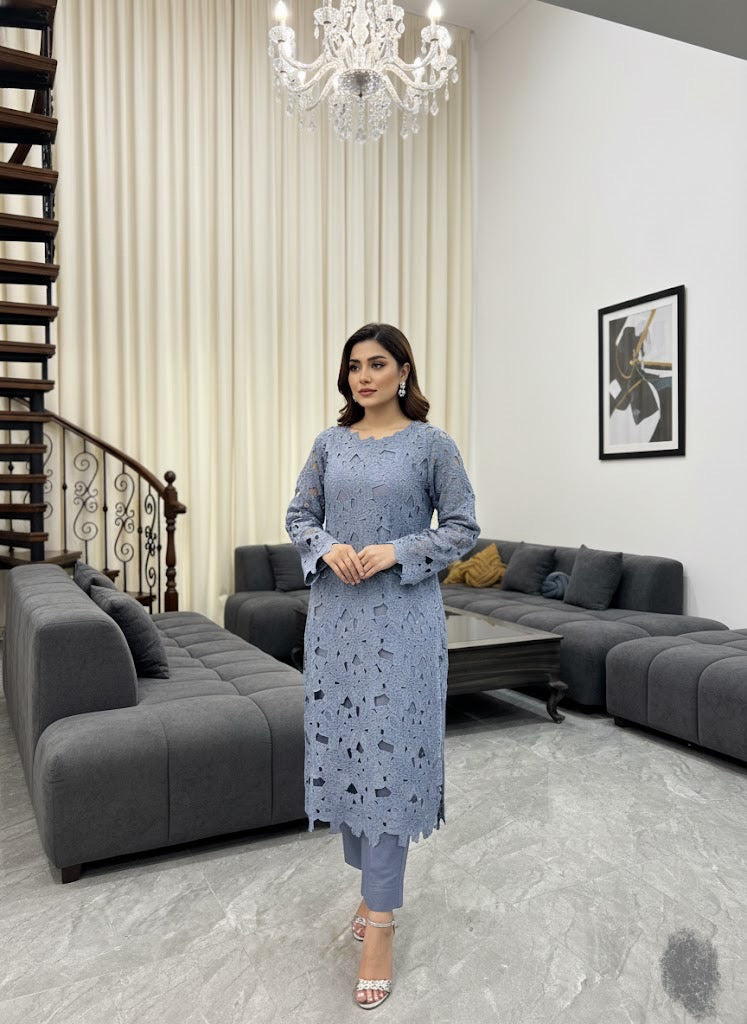 This two-piece outfit in soft powder blue is crafted from pure cutwork fabric, giving it a stylish and airy look. The short shirt features delicate detailing that adds a touch of modern charm, paired with flared pants for a graceful, trendy silhouette. Powder Grace blends comfort with elegance, making it perfect for any occasion.