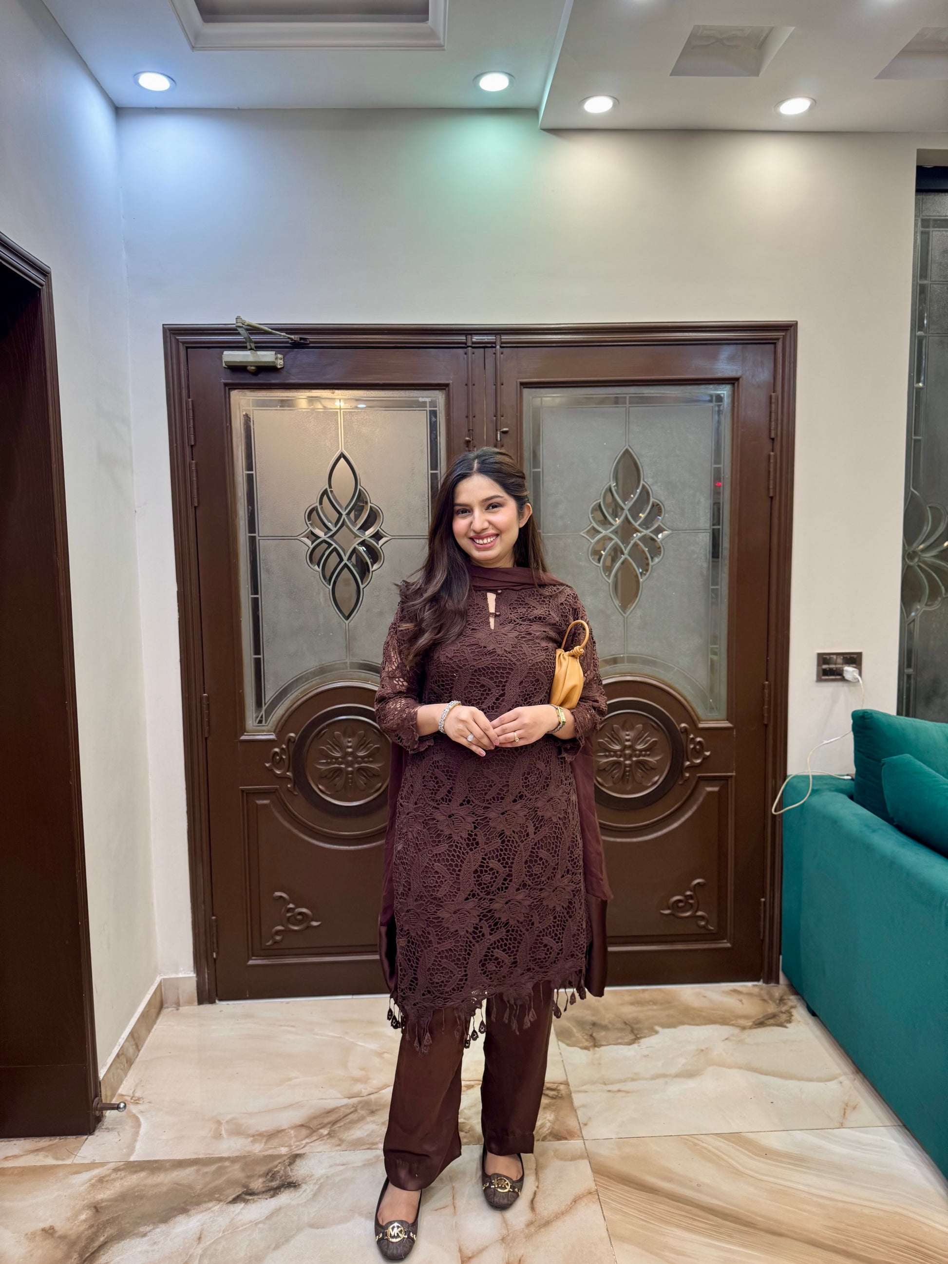 Elegant Croshia suit featuring a long shirt paired with a silk trouser and a 3-meter dupatta with a silk border. A perfect blend of tradition and sophistication." length of shirt is 42-44