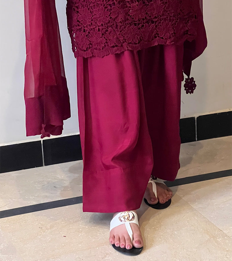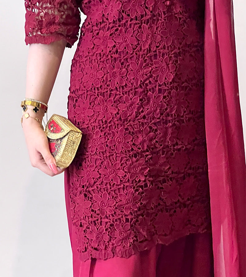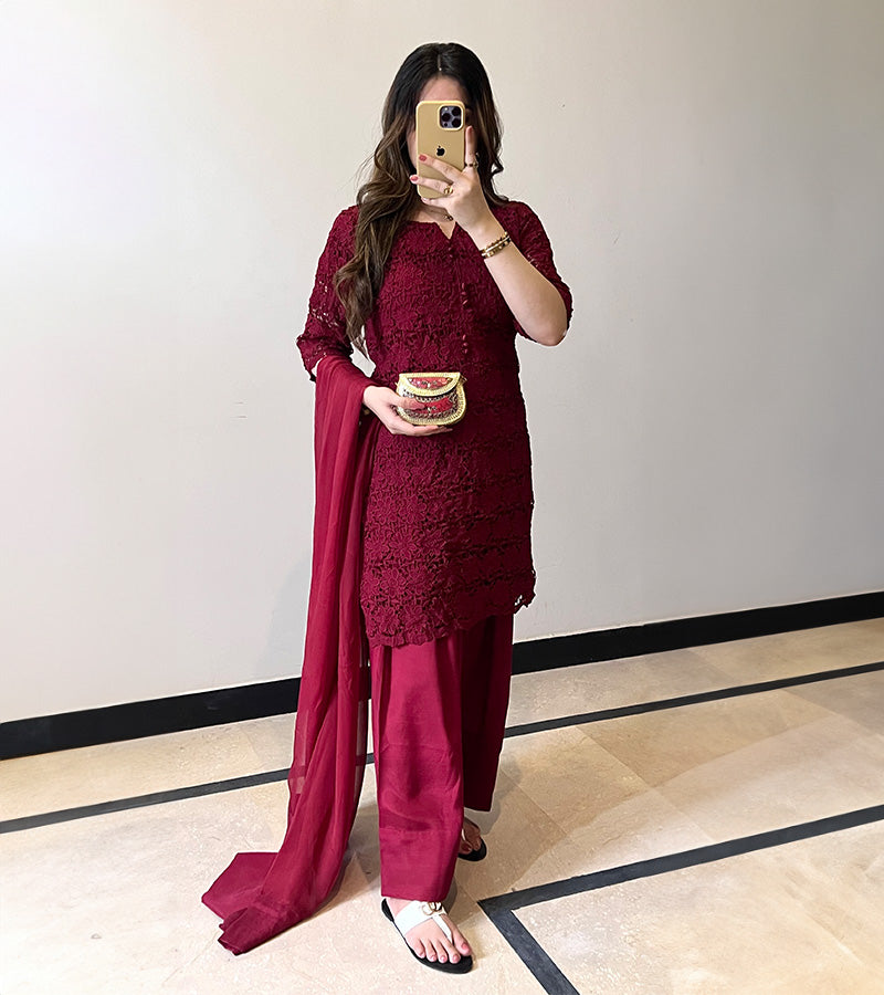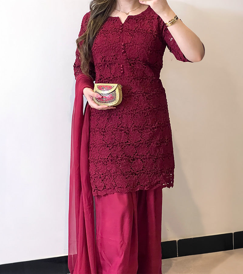 This elegant outfit is crafted using delicate Crosia net fabric, designed specially for a graceful and stylish look.