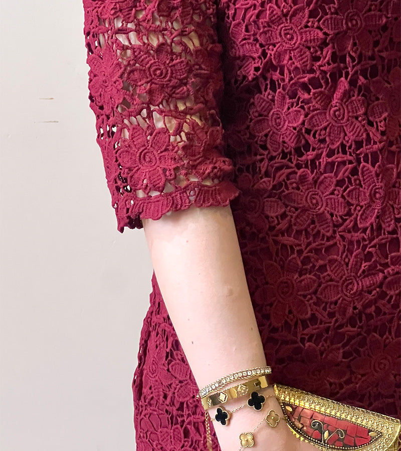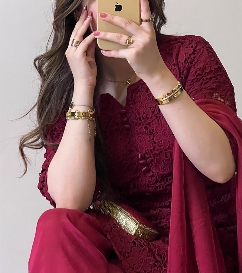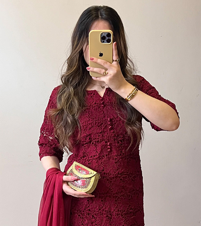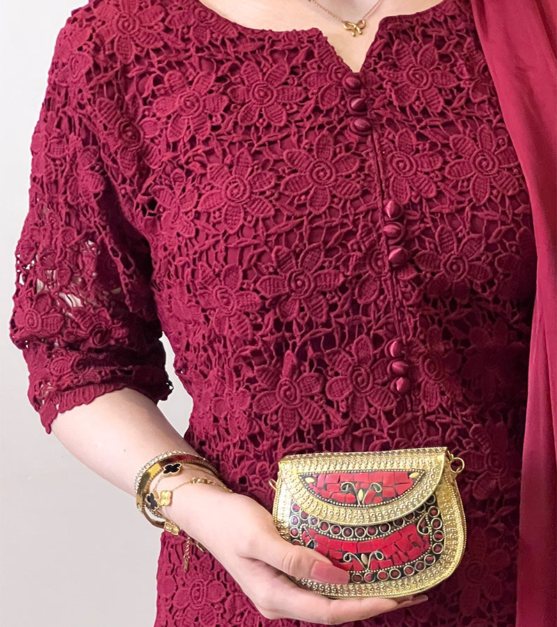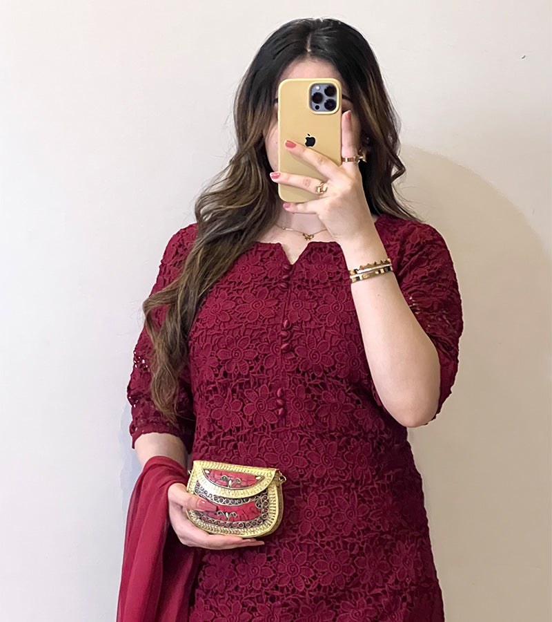 This elegant outfit is crafted using delicate Crosia net fabric, designed specially for a graceful and stylish look.