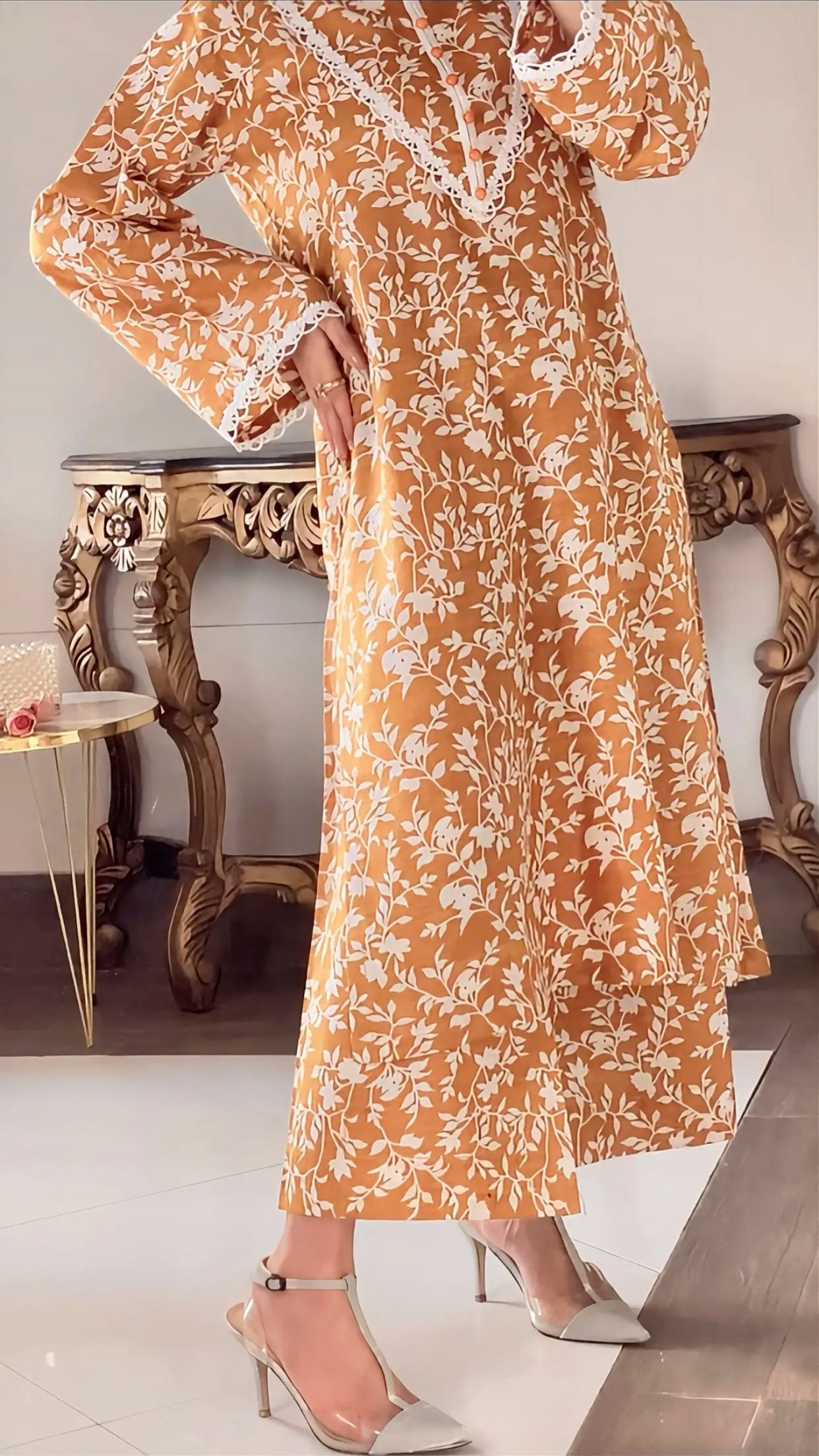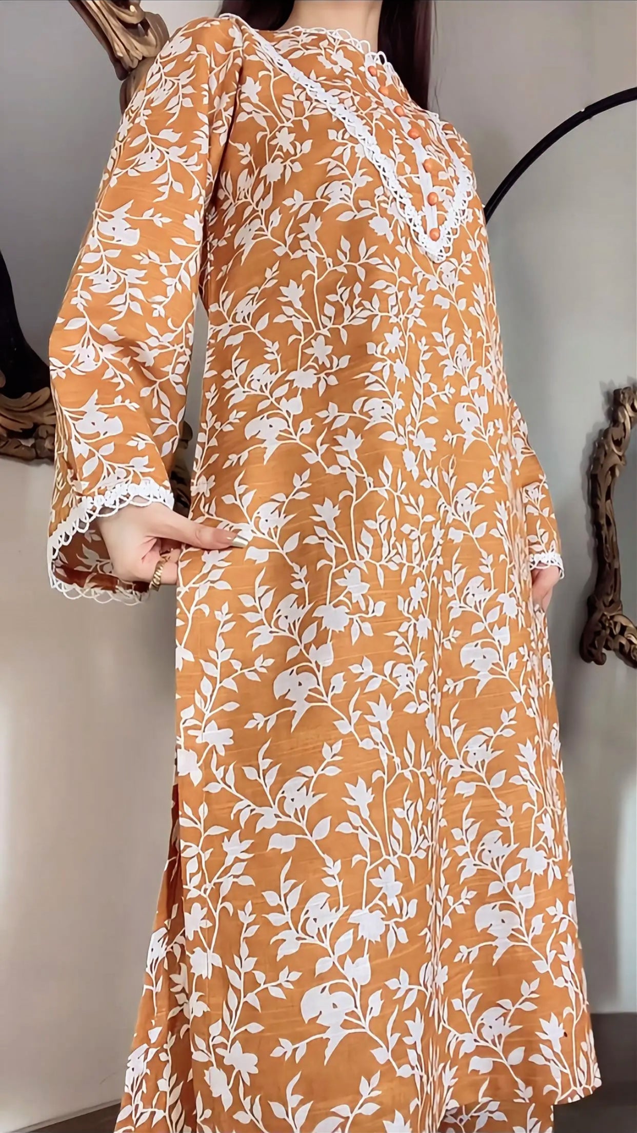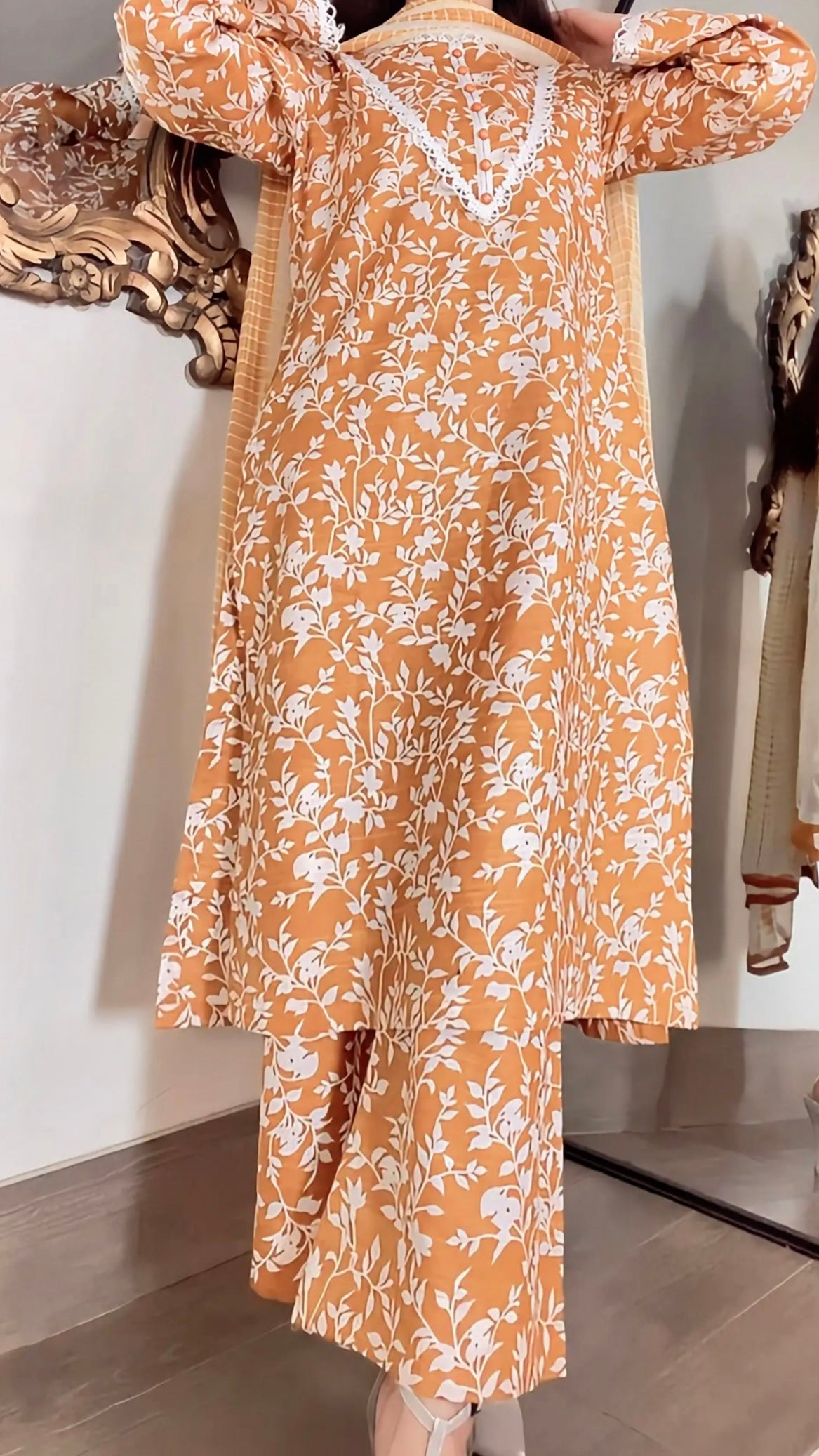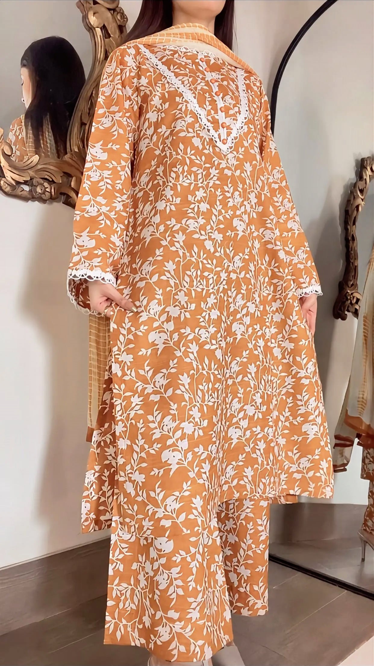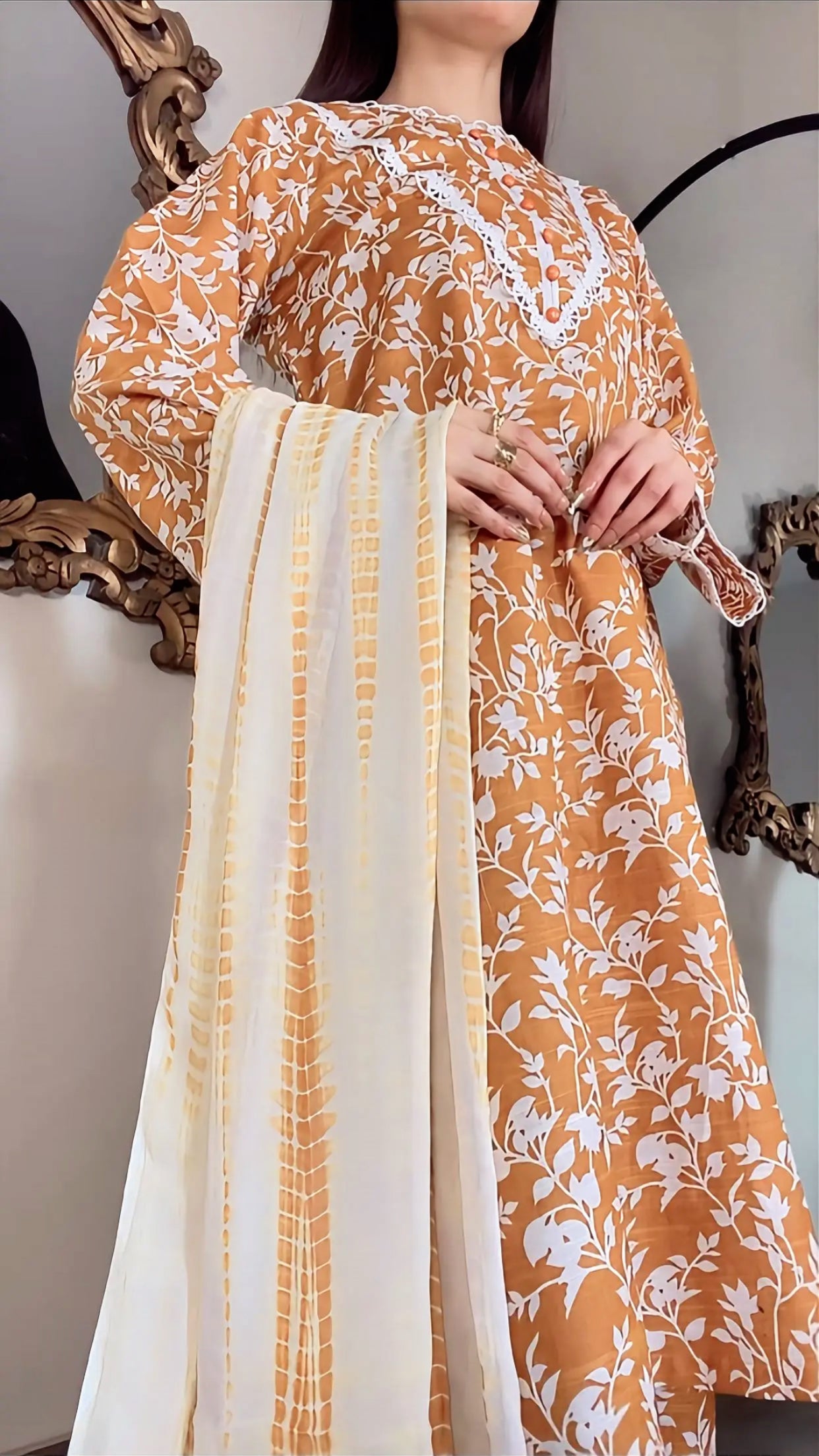 A rich, warm-mustard base article with a white botanical print, a very classy and trendy color combination. This khaddar article having minimal detailing on the sleeves and neckline, finished with delicate buttons with soft tie-and-die dupatta