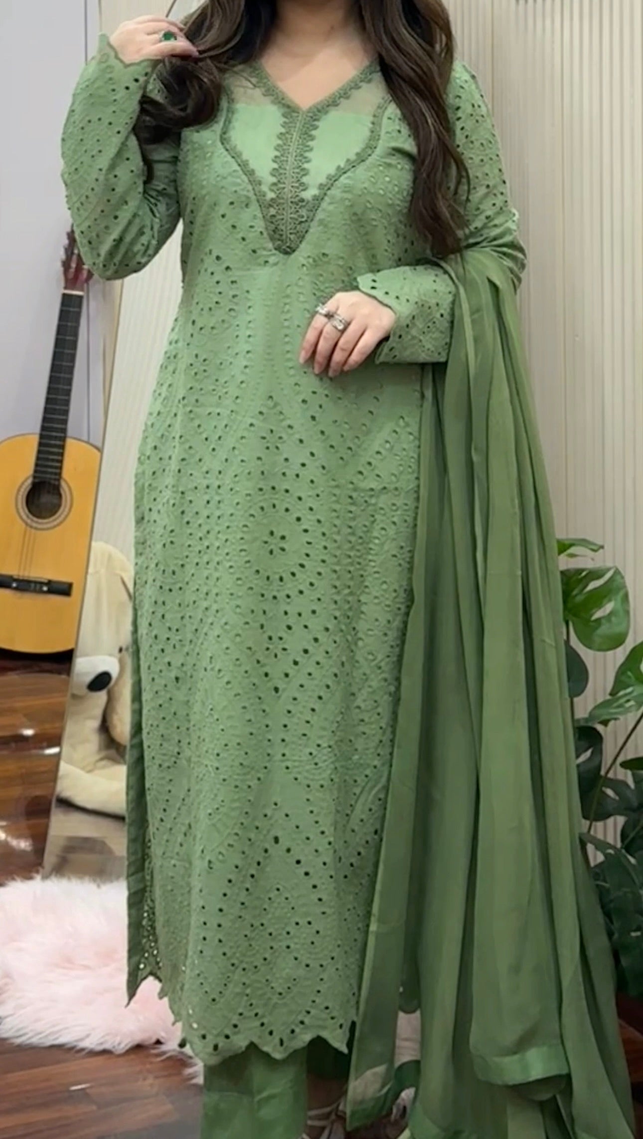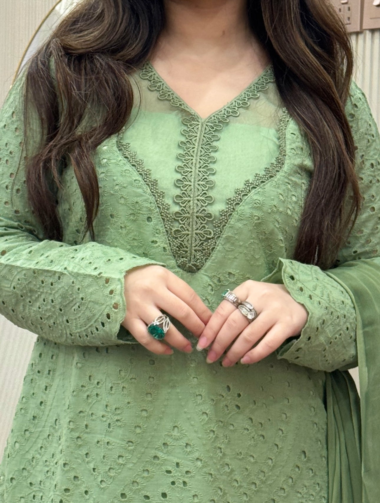 This three-piece suit comes in soft mint. The chikankari shirt has a full length sleeves and a very unique neckline decorated with pure milky lace, making it stand out beautifully. It is paired with a comfortable trouser and a light chiffon dupatta, giving a fresh and elegant look.