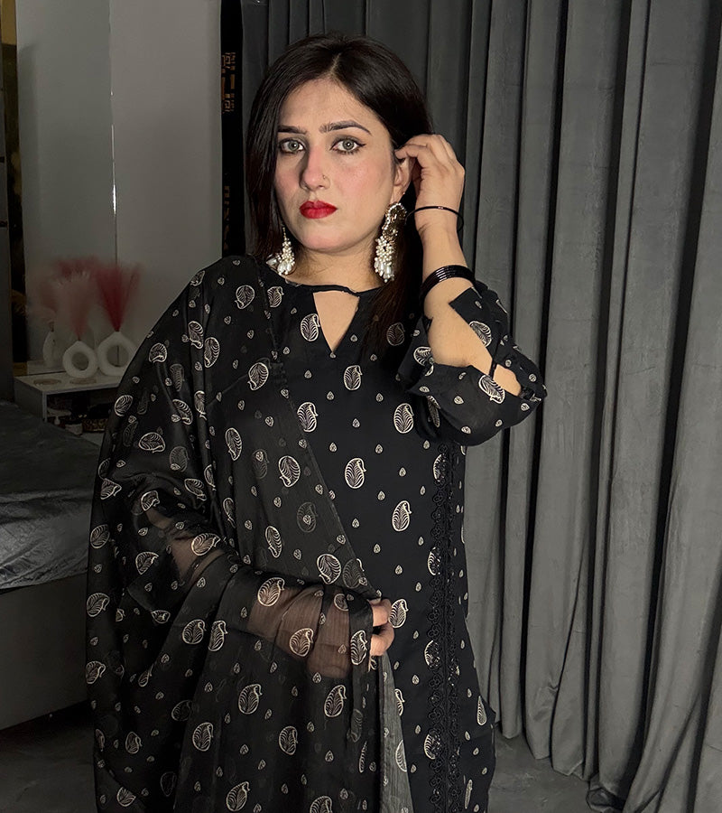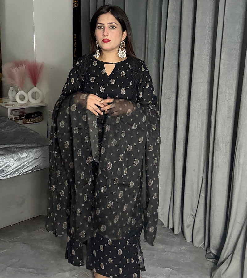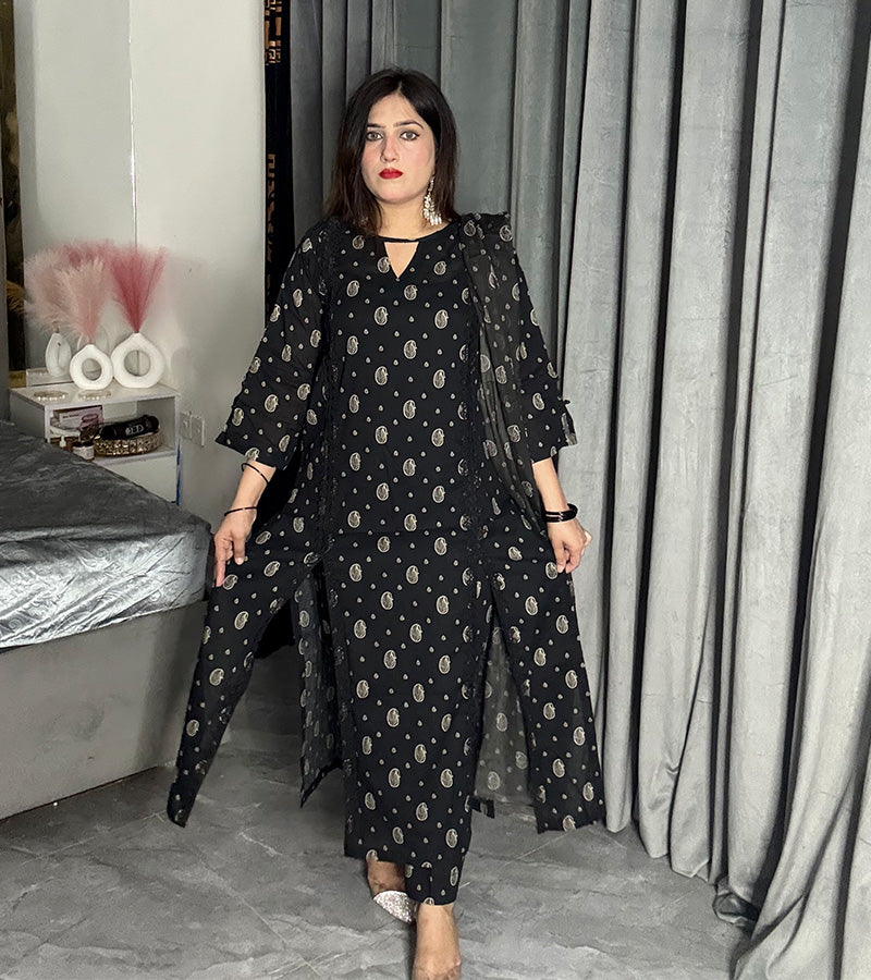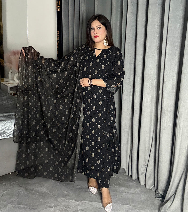 A stylish lawn shirt featuring a front open panel adorned with delicate lace detailing, paired perfectly with matching trousers and a flowing chiffon dupatta.