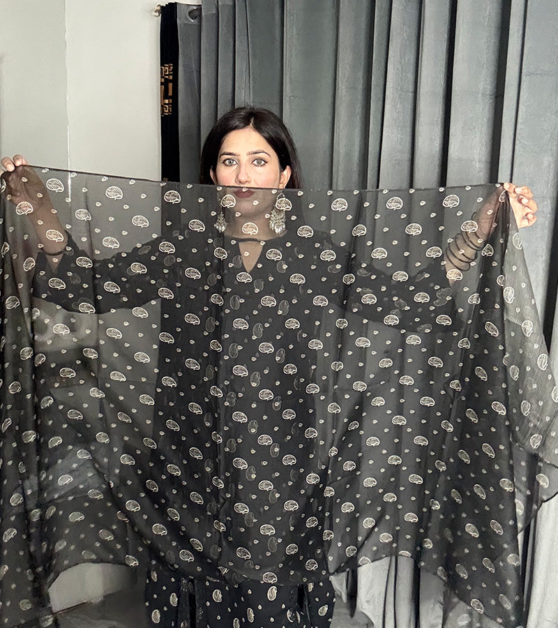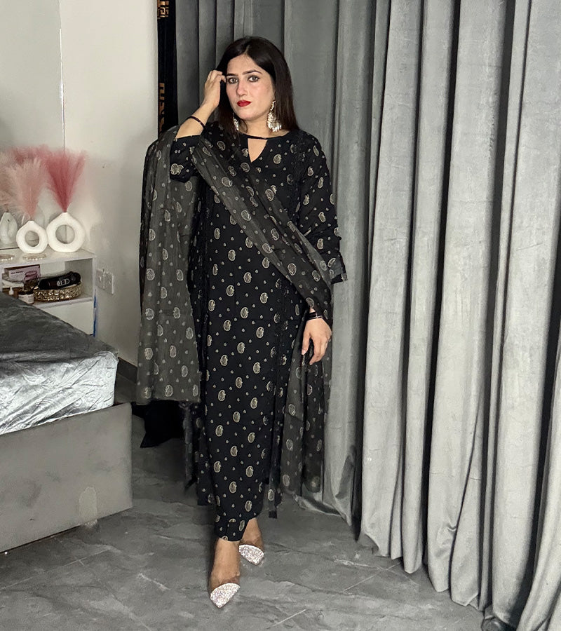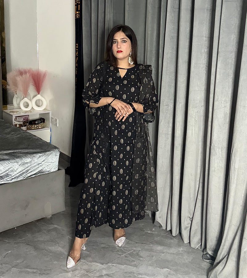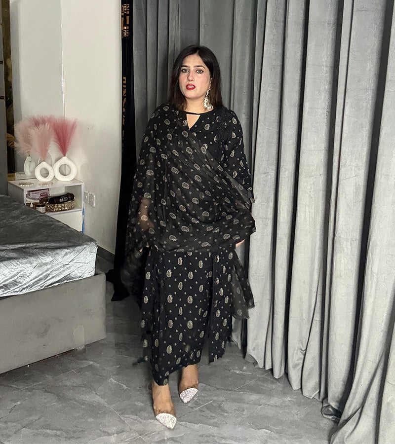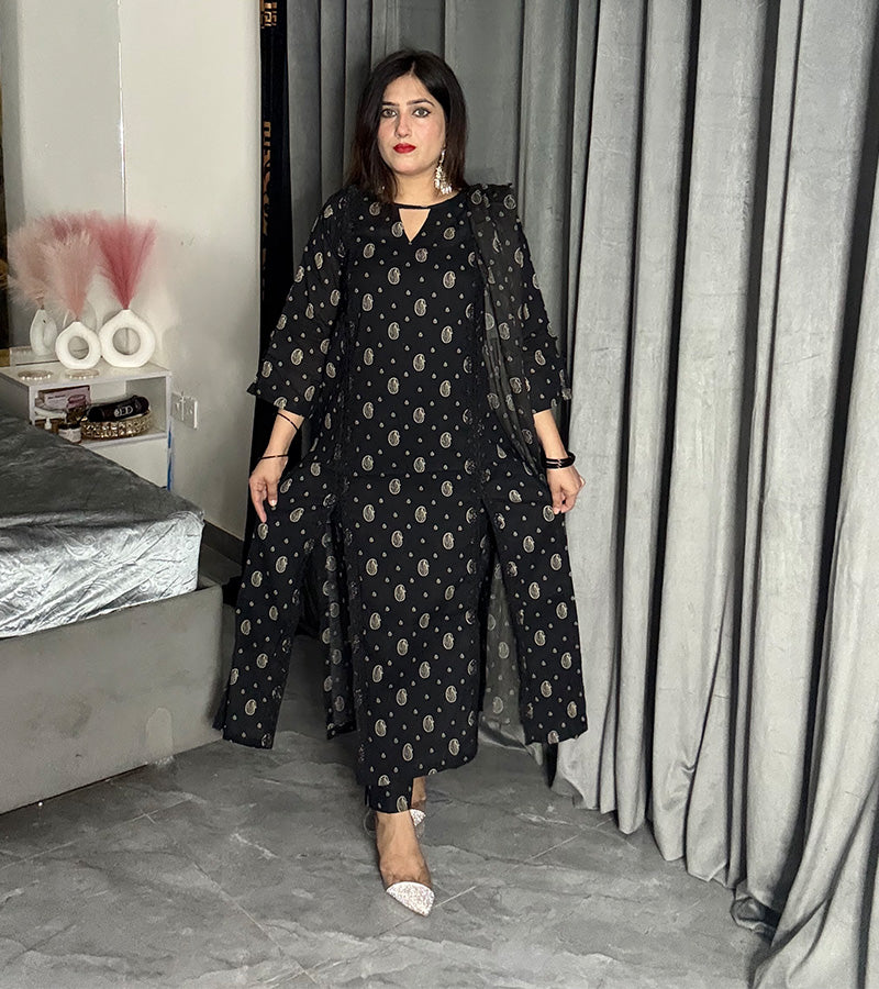 A stylish lawn shirt featuring a front open panel adorned with delicate lace detailing, paired perfectly with matching trousers and a flowing chiffon dupatta.