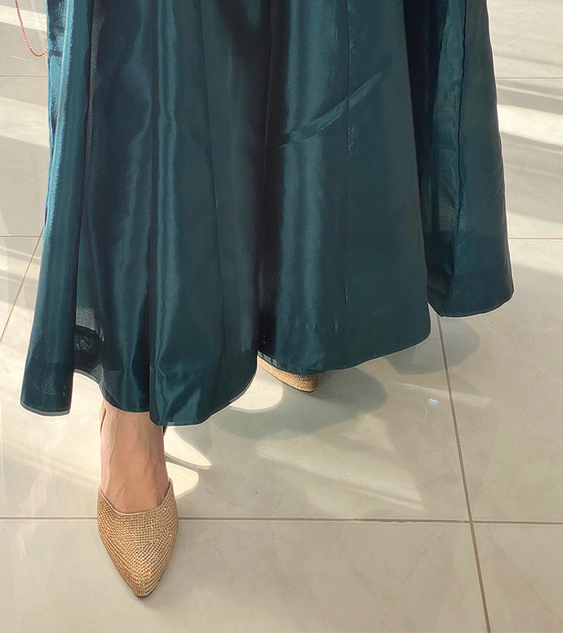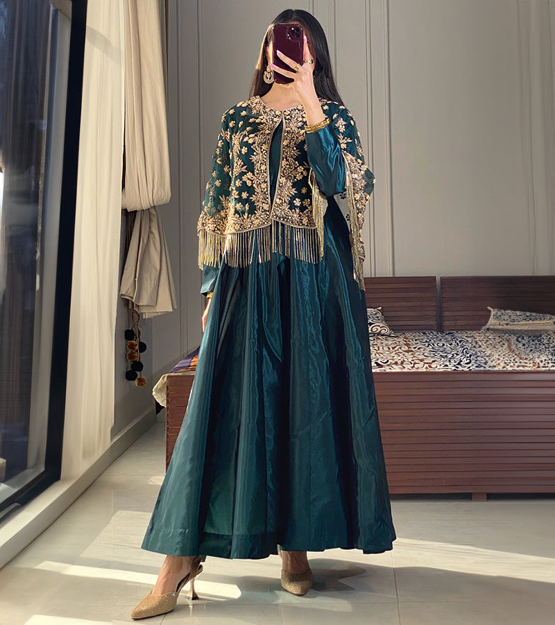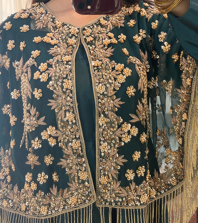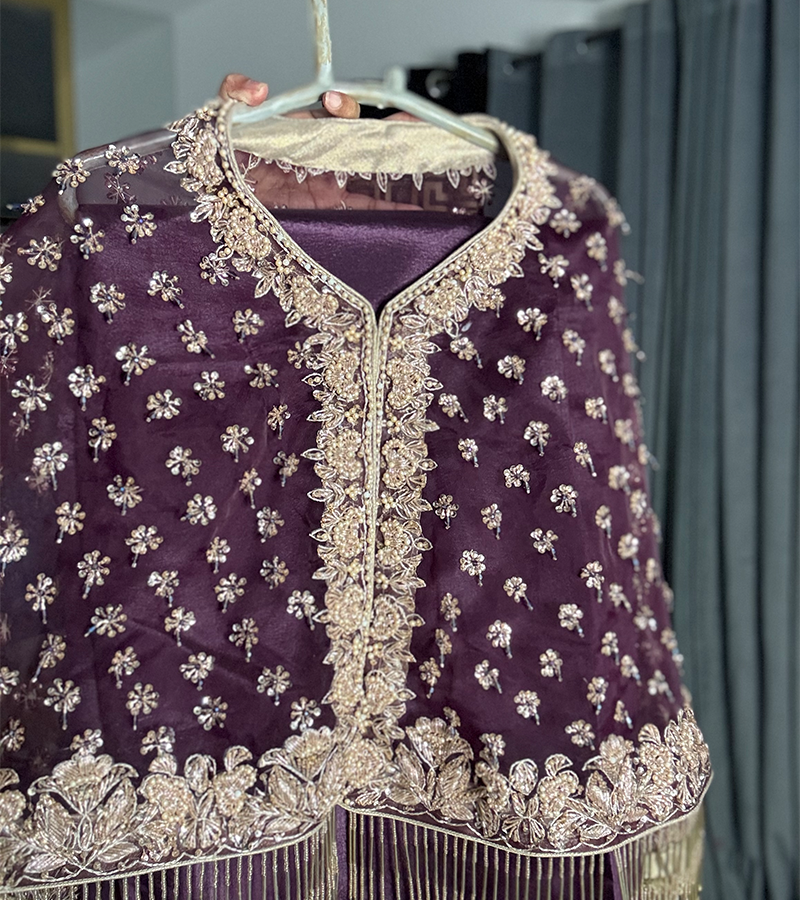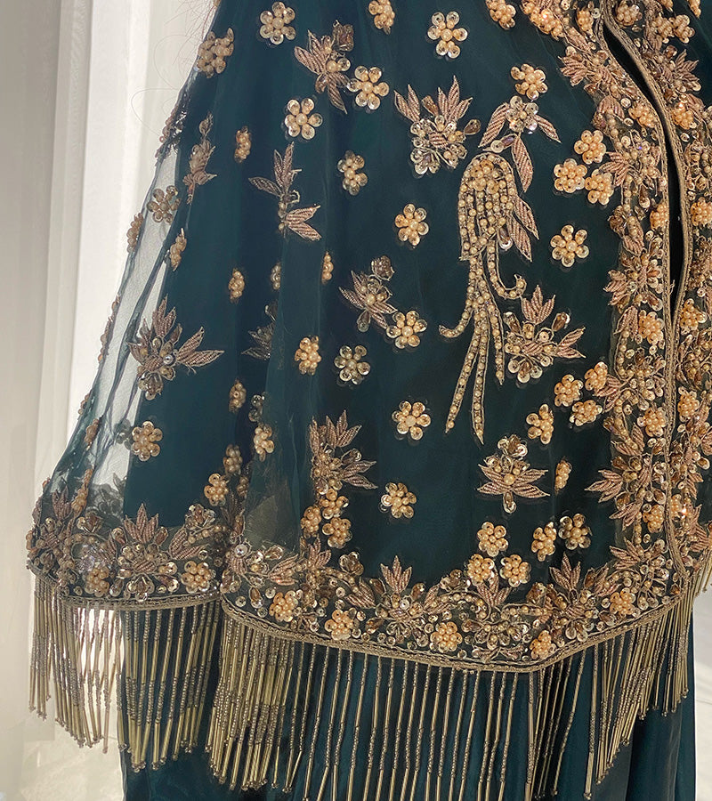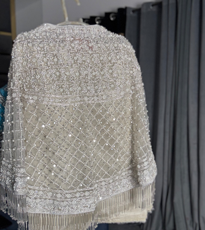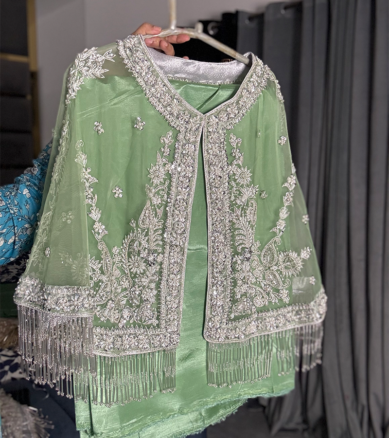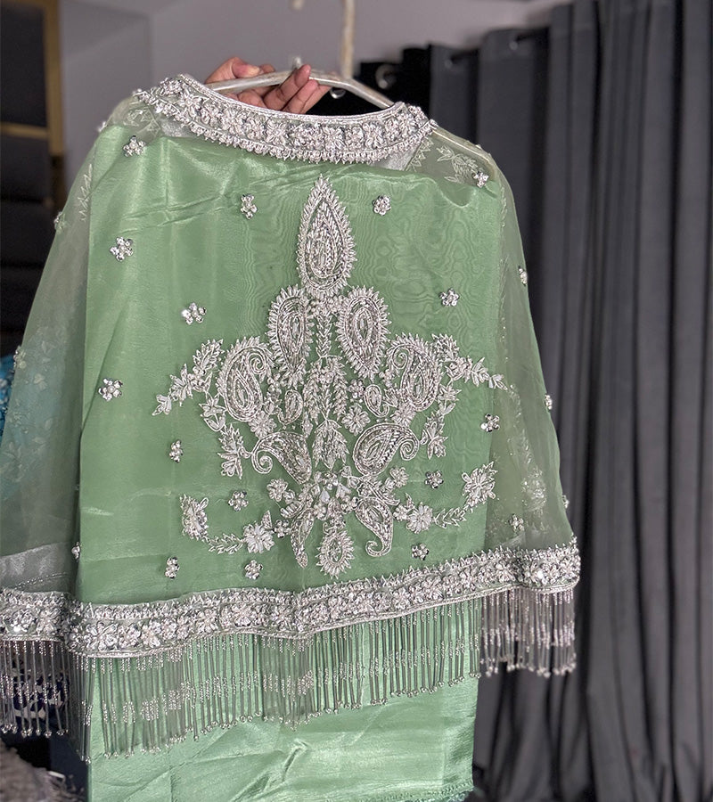 This stunning outfit features a jacket with intricate heavy hand-embroidery on organza net fabric, enhanced with delicate tingle detailing for a sophisticated touch. The luxurious raw silk unstitched 2 piece ( you can make frock, maxy, skirt, tail or pants ) adds a rich, graceful finish, perfectly complementing the embroidered jacket. A true blend of timeless elegance and opulence, ideal for celebrating Eid in style.