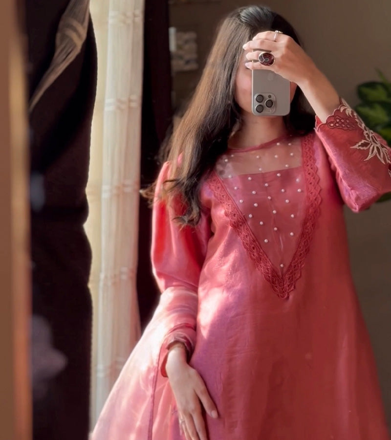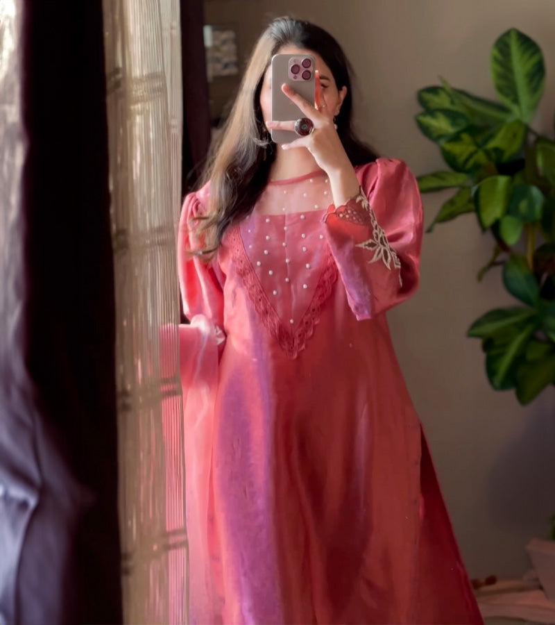 The luxurious outfit ensemble showcase a heavy embroidery border and sleeves, Neckline detailing with organza, pearls and laces. Decent detailing on trouser. Tissue dupatta with four sided pearls attached
