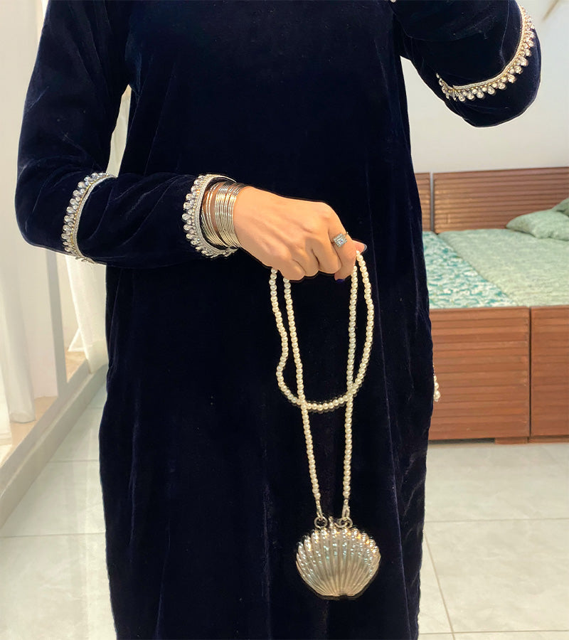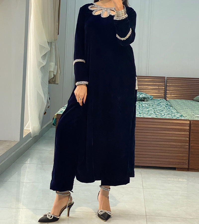 This exquisite 9,000 micro velvet outfit in royal blue features a unique cut-out neckline design, elegantly adorned with a heavy crystal neckline bunch for a touch of opulence. The sleeves are detailed with crystal lace, adding a refined sparkle. The stylish chalk is enhanced with tassels on both sides, creating a graceful finish. This piece is the perfect attire for any occasion, blending luxury with contemporary design.