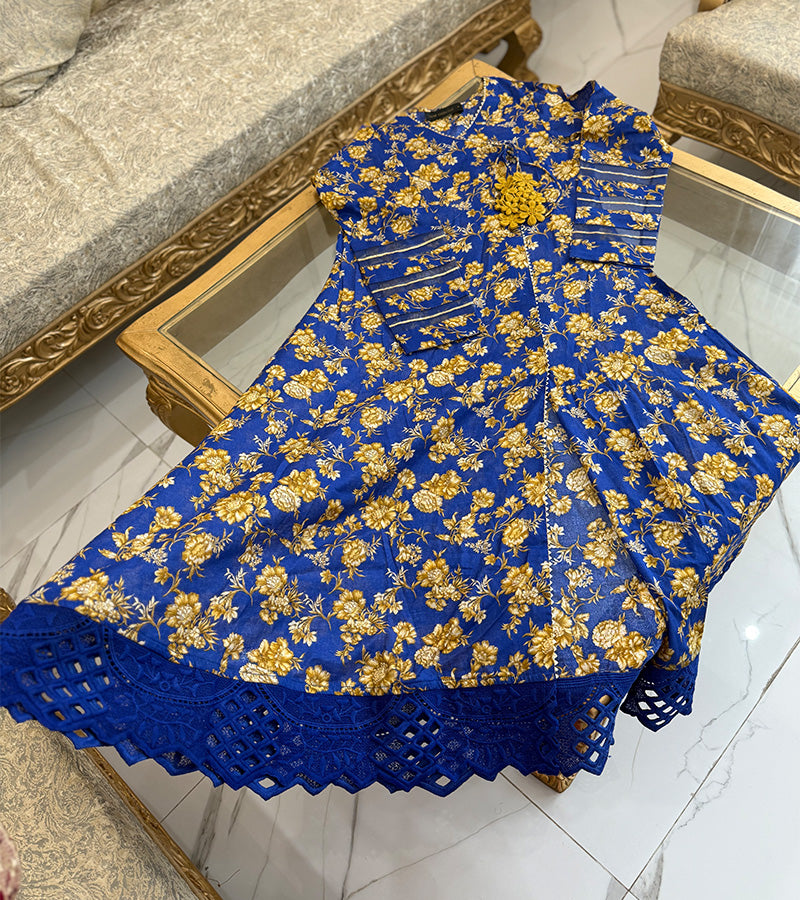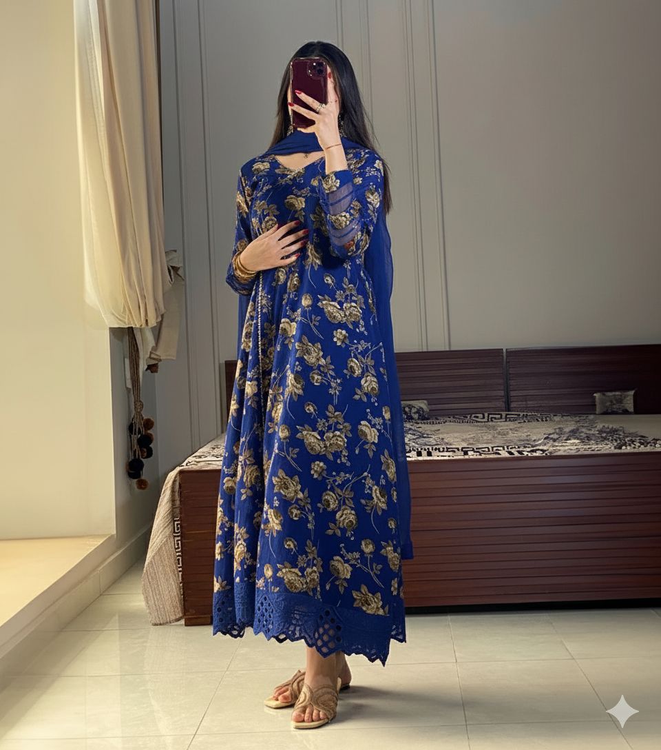 This exquisite Anarkali features a flowing silhouette with a heavy lace border and delicate organza-detailed sleeves, striking the perfect balance between grace and sophistication.