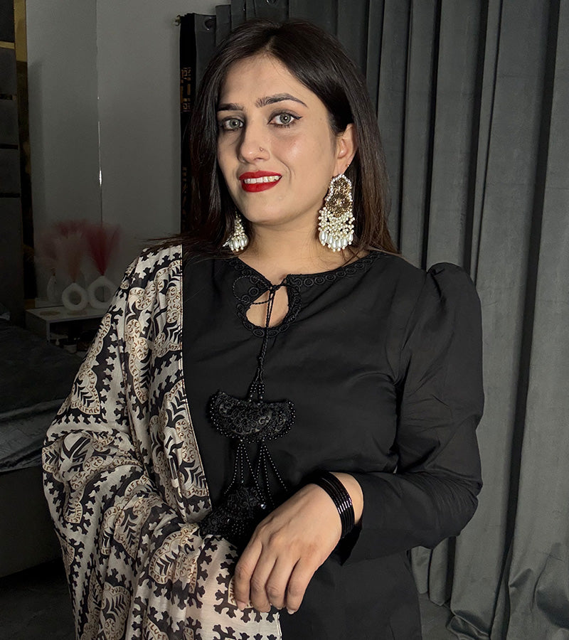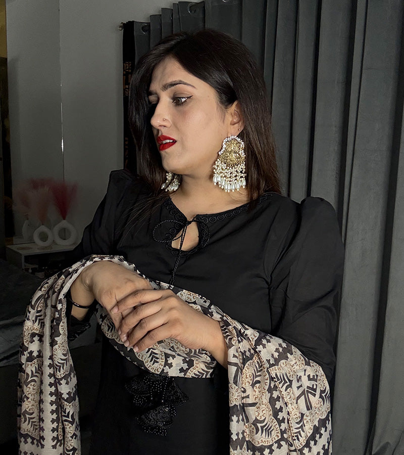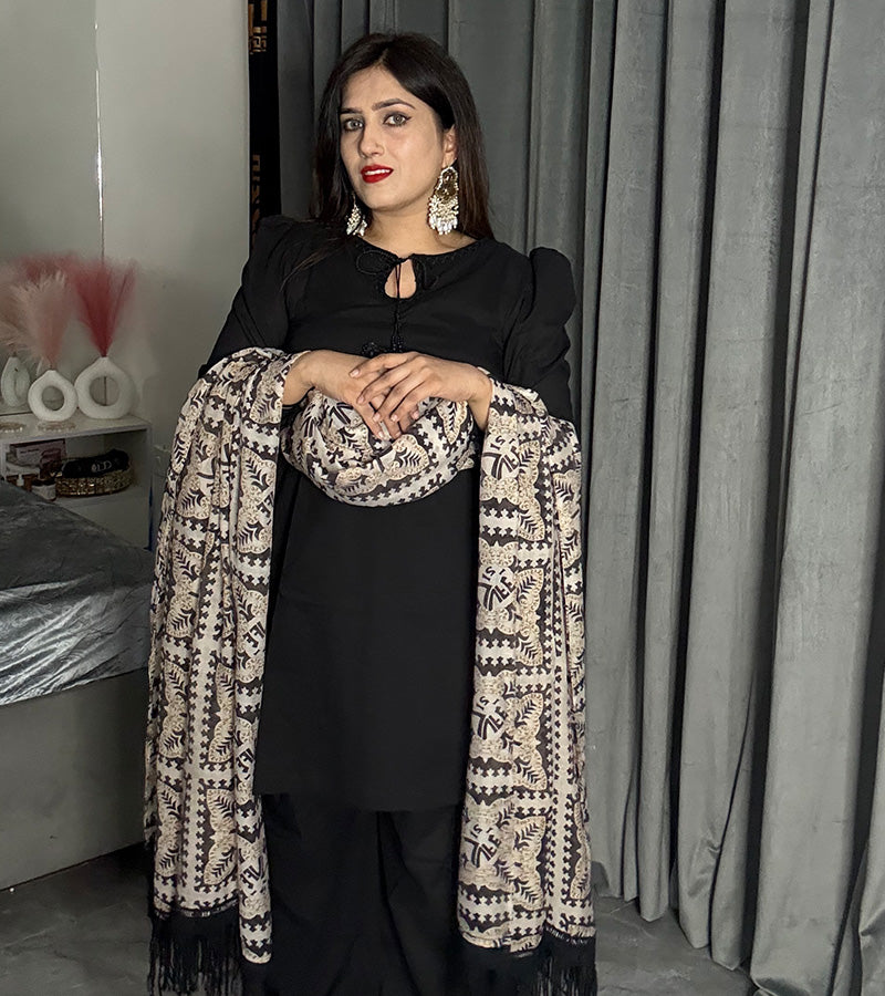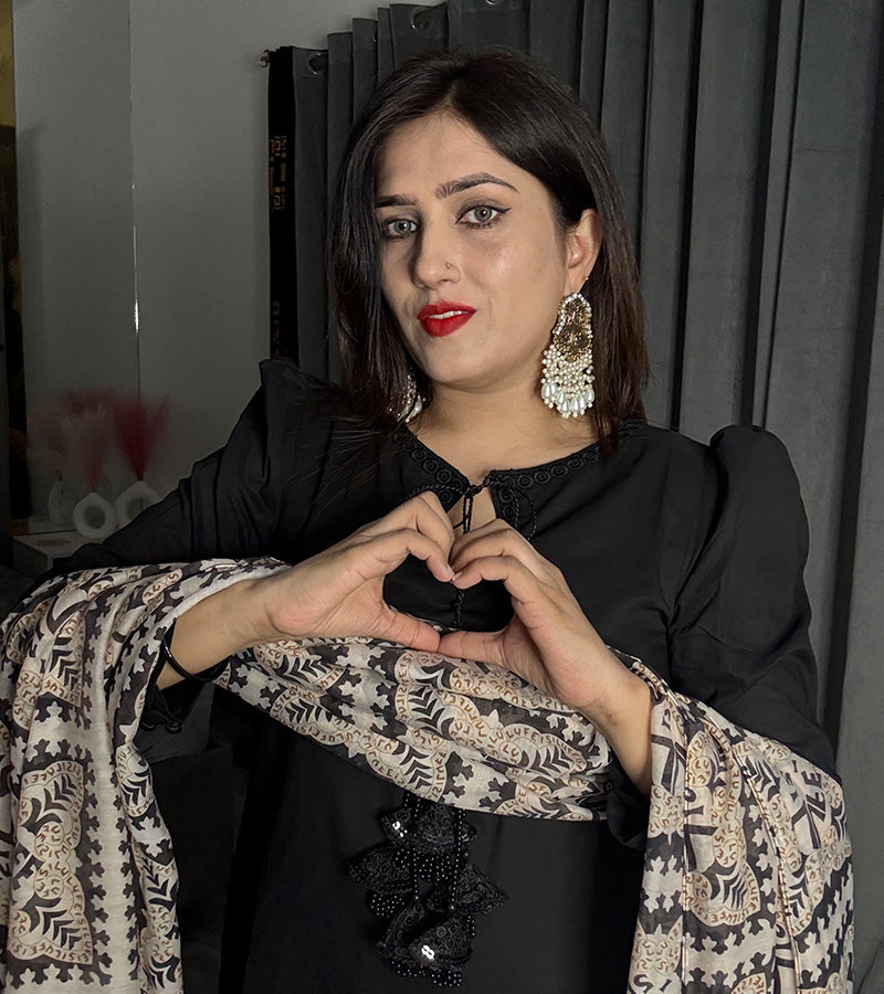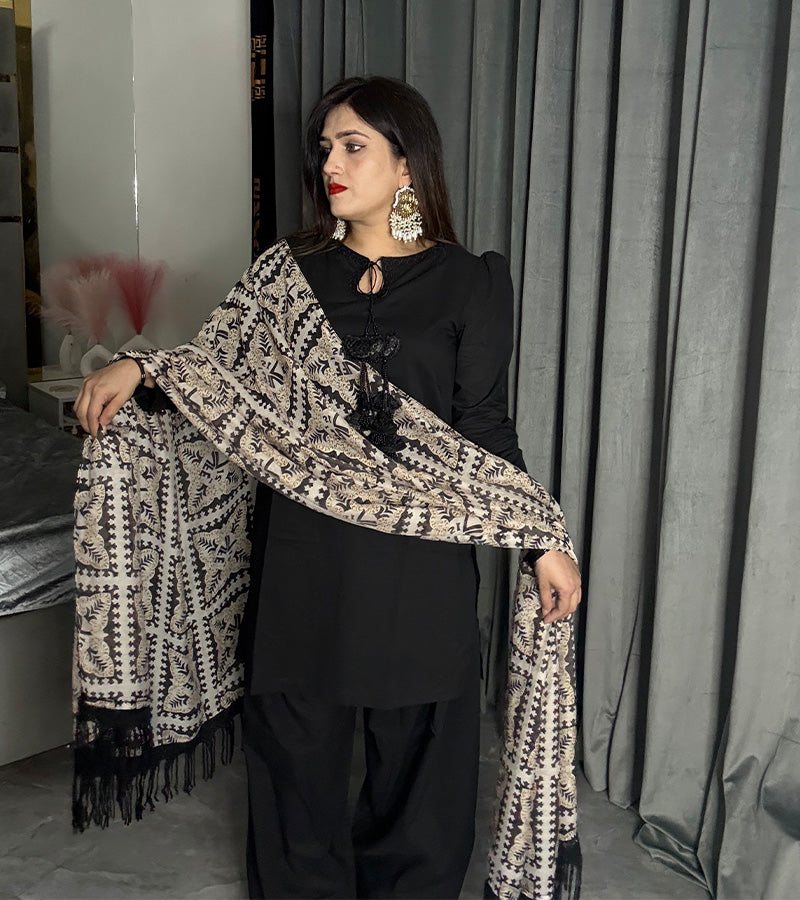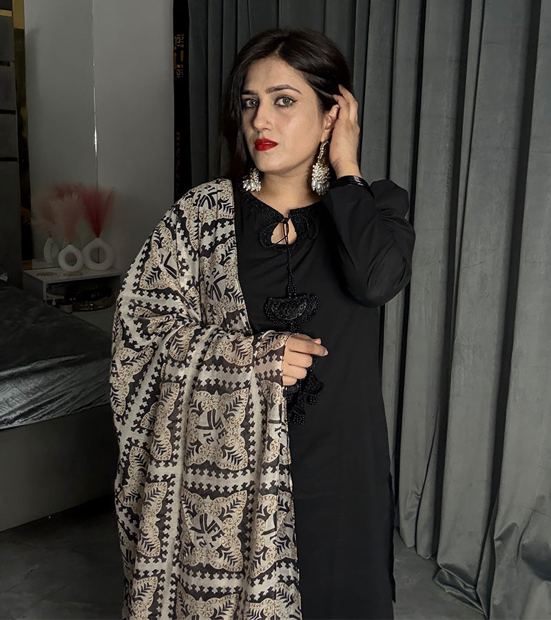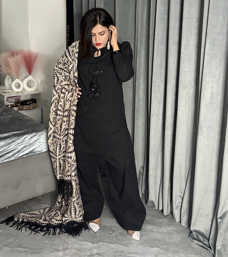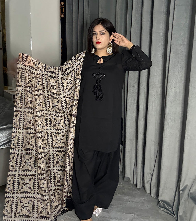 A graceful black shirt with delicate dori necklining and puffy sleeves with button. Paired with flowing farshi shalwar, and a dupatta finished with intricate latkan lace detailing—this ensemble blends tradition with modern elegance.