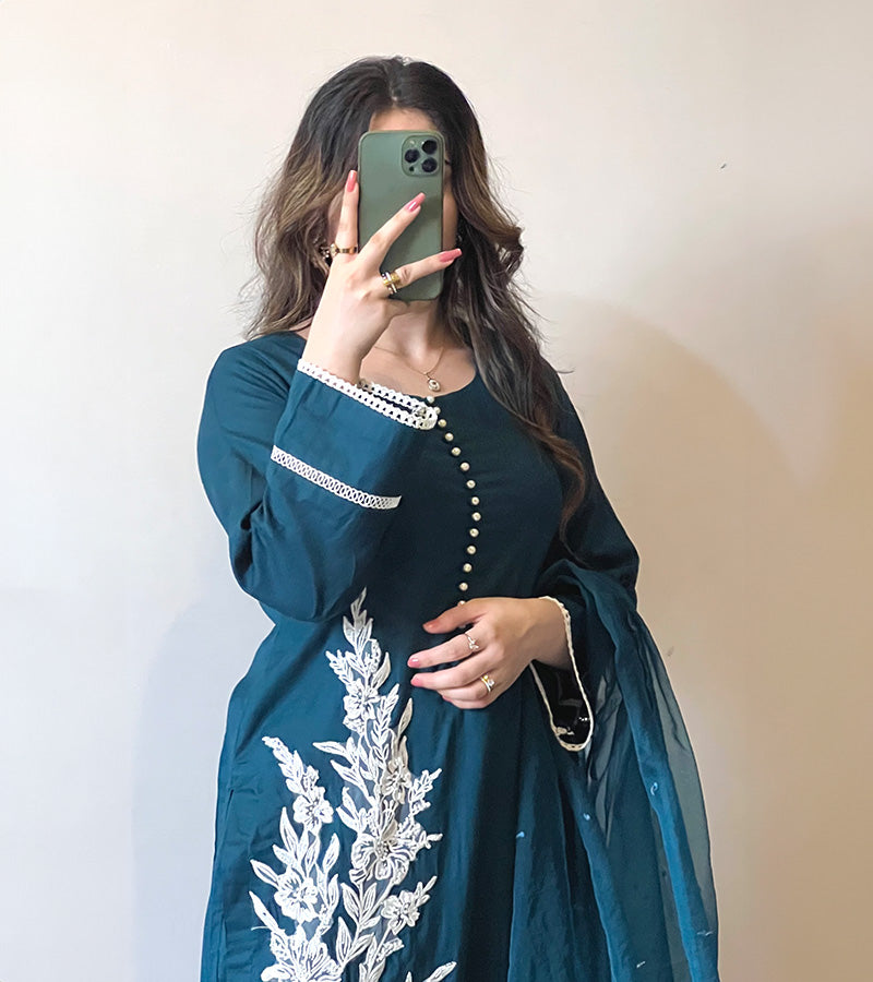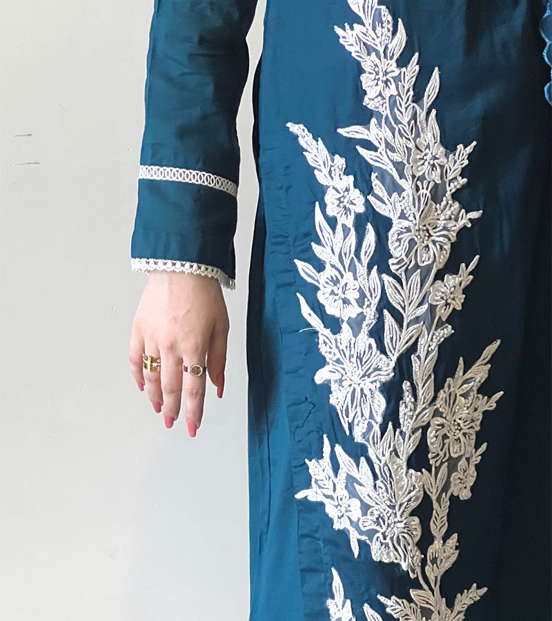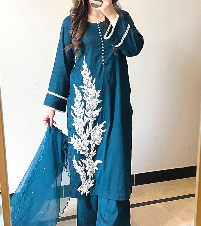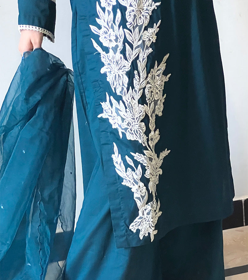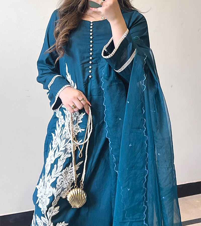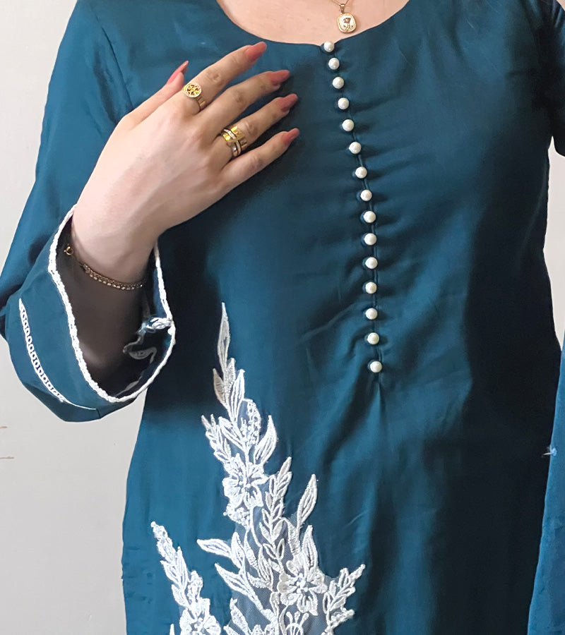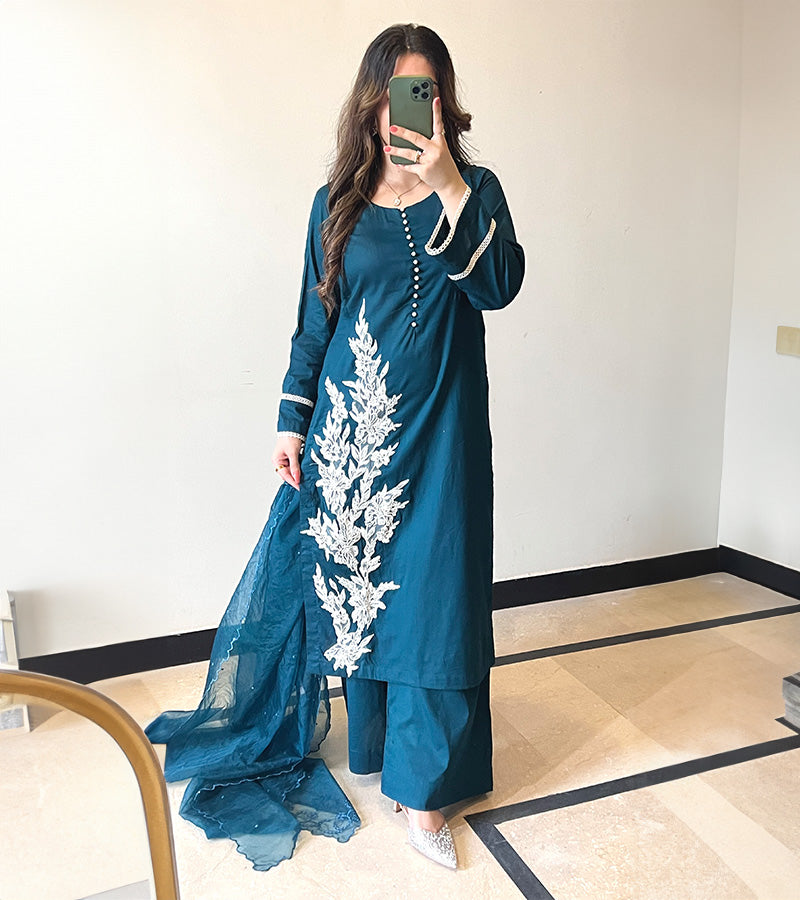 3 piece embroidered dress in a beautiful teal colour , long-sleeved garment with intricate white embroidery along the neckline, front, hem, and sleeves. It is paired with a matching dupatta featuring a scalloped edge and white embroidery. The outfit is complemented by black leggings or trousers underneath.